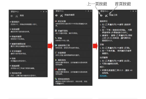 在「首頁」出現的每項工作都有所屬的主題,包含說明相關工具或指令的指示。您可以按一下指定主題,存取相關工具或指令。在此情況下,當您了解後,即可執行工作。您也可以存取「學習中心」面板的「說明」,取得關於工作的其他資訊。