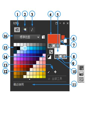 | 「色彩控制」面板 1 「樣本」標籤 2 「HSL 貼圖」標籤 3 「滑桿」標籤 4 前景及筆觸內容 5 背景及填色內容 6 前景和背景色彩方塊 7 「對調色彩」按鈕 8 透明選項 9 「材質」按鈕 10 樣式 - 色彩、漸層、樣式 11 最近使用 12 「樣本色彩」工具 13 「新增到色盤」與「從色盤移除」 14 設為黑白 15 「目前」面板 16 色盤選取選單 |