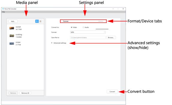 n Settings panel: The basic settings available in this panel change depending on whether you are converting video, image, or audio files.