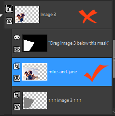 Das rote X kennzeichnet die Gruppenebene. Das rote Häkchen kennzeichnet die Bildebene. Sie müssen die Bildebene auswählen, bevor Sie die Ebene im Bildfenster bearbeiten.