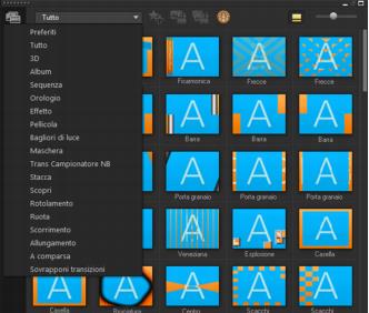 Nella Libreria sono presenti 16 tipi di transizioni. Per ciascun tipo, è possibile scegliere uno specifico effetto preimpostato mediante le miniature. Ad esempio, è possibile scegliere tra gli stili di transizione più comuni come Dissolvenza, Dissolvenza incrociata e Dissolvenza in nero.
