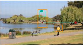 In questo esempio, Tracker 1 traccia il ragazzo mentre Tracker 2 traccia la struttura fissa sul lago. Poiché la fotocamera esegue una panoramica verso destra, il risultato mostra il percorso di dell'indicatore 1 che si sposta verso destra e il percorso dell'indicatore 2 che si sposta verso sinistra.