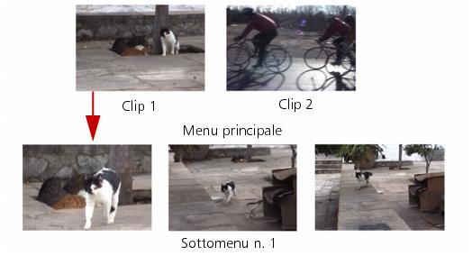 In questo esempio, Clip 1 ha tre capitoli, perciò, quando si fa clic sulla miniatura video del Clip 1, si passa al sottomenu n. 1. Se si osserva il Clip 2, si nota che non ha alcun capitolo assegnato, perciò, quando viene selezionato, il video inizia la riproduzione dall'inizio.