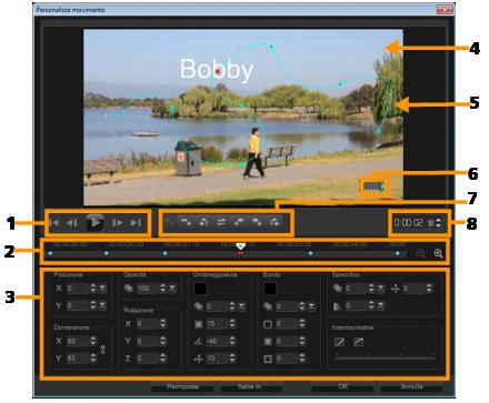 5 - Percorso di spostamento | Il percorso del movimento definito manualmente. Visualizzato solo nella finestra di dialogo Personalizza movimento. |