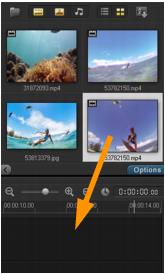 L'aggiunta di clip e foto a un progetto video è molto semplice: basta trascinare le miniature per i clip video e le foto che si desidera utilizzare dalla Libreria alla linea temporale.