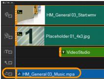 4 La musica viene aggiunta alla Traccia musicale e, come con altri clip, è possibile trascinarla in una nuova posizione nella linea temporale e ritagliarla trascinando gli indicatori di inizio e fine.
