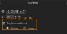 Per duplicare un canale audio, fare clic su Mix audio sulla barra degli strumenti. Fare clic sulla scheda Attributo e selezionare Duplica canale audio. Scegliere quale canale audio duplicare: Sinistra o Destra.