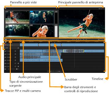 La seguente immagine identifica le principali funzionalità dell'Editor multi-camera.