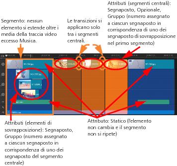 Il progetto qui sopra ha cinque segmenti. Le aree blu indicano il primo e l'ultimo segmento, mentre le aree arancioni indicano i tre segmenti centrali. Gli attributi scelti per questo progetto assicurano che le aree blu appaiano una volta sola (segmento iniziale e segmento finale) e i segmenti arancioni si ripeteranno in sequenza fino a che tutti i media non saranno a posto. Il media dell'utente che appare nelle sovrapposizioni di ingresso piccole compariranno anche all'interno della presentazione principale.
