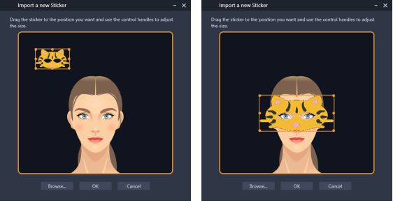 5 在「匯入新貼圖」視窗中,將匯入的影像拖曳至所需的位置,然後拖曳角落節點以調整貼圖大小。確保貼圖按照您要相對於臉部的顯示方式對齊。