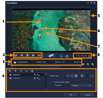 1. Tracker | Désigne l'objet à suivre pour créer le chemin de suivi. Il peut également apparaître sous forme de zone selon le type de tracker sélectionné. |