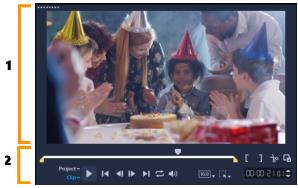 プレイヤー パネルは、プレビューウィンドウ(1)とナビゲーション エリア(2)で構成されています
