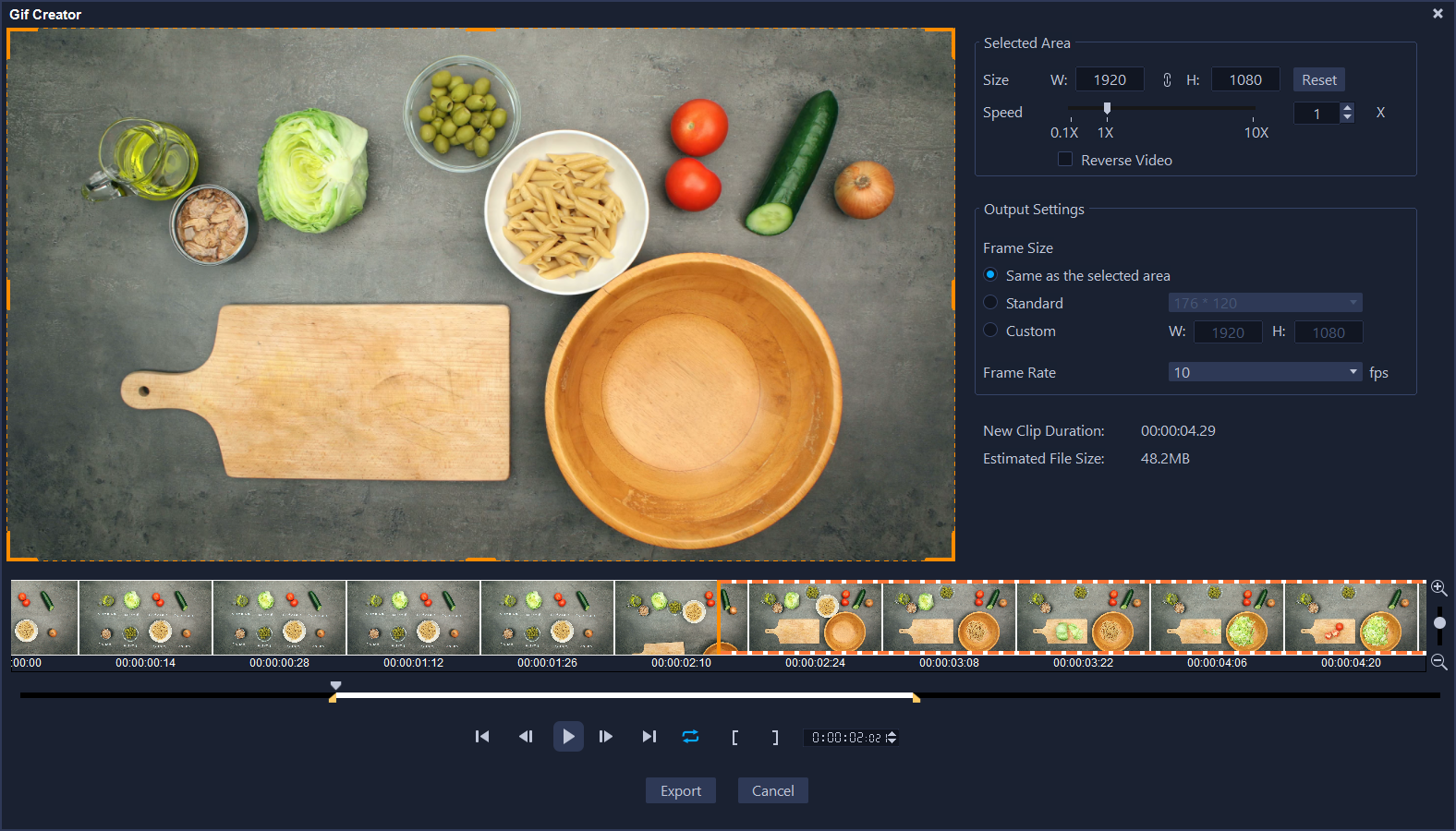 3 如果要修整素材,使用 GIF 创建器窗口中的任何标准修整工具。使用播放控件预览更改。
