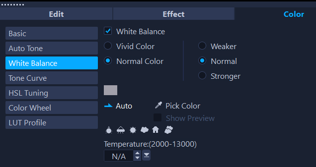 • 白平衡预设 — 从包括鲜艳色彩或正常色彩的预设中进行选择,并使用较弱、正常和较强选项调整预设的级别。