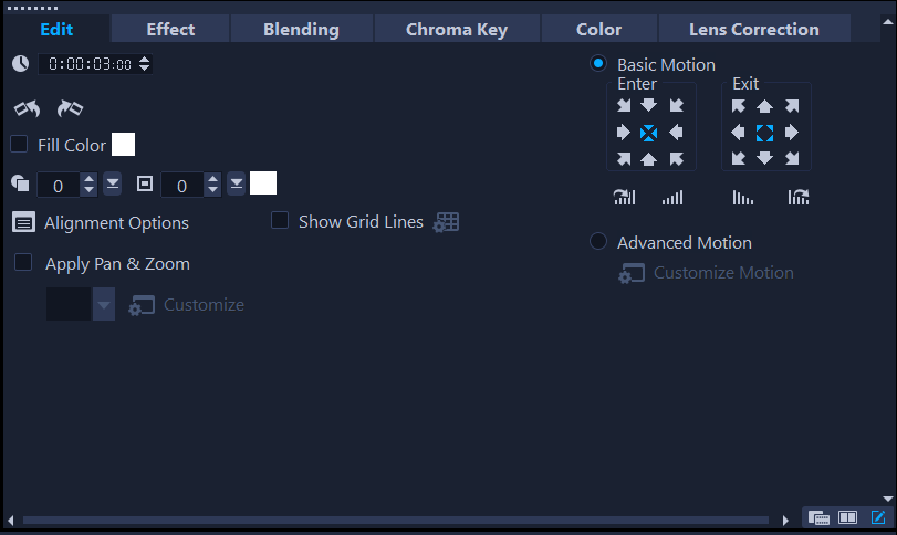 编辑工作区中的选项面板允许您修改添加到时间轴的媒体、转场、标题、图形、动画和滤镜。可用的控件取决于您选择的媒体类型以及媒体是处于覆叠轨还是主视频轨中。