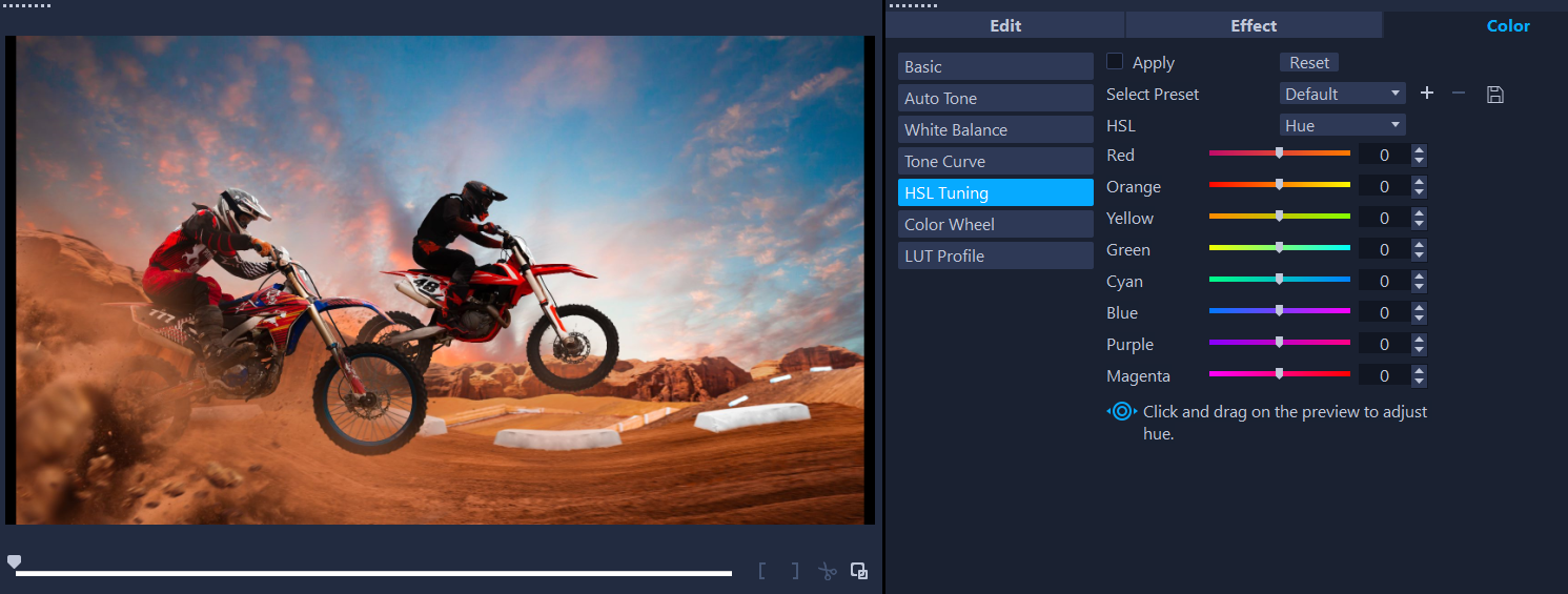 HSL(色调、饱和度、亮度)是一个功能强大的色彩调整工具,可让您以交互方式调整素材中的色彩。这使您可以瞄准特定色彩。