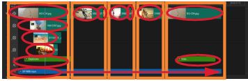添加到主视频轨中的每个图像或视频素材会创建一个片段(用橙色框表示)。每个片段可以有多个元素(用红色椭圆形表示)。