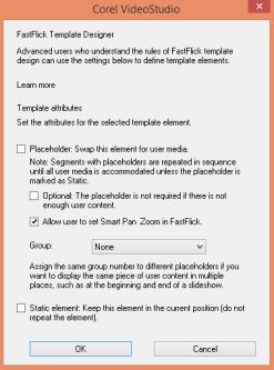 通过影音快手模板设计器对话框,可向模板中的元素分配属性。要打开对话框,请右键单击时间轴上的模板元素并选择影音快手模板设计器。
