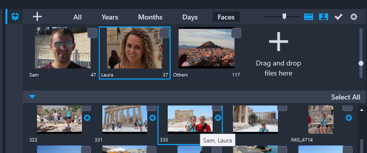 如果一个媒体文件中有多个人脸,则可以使用每个人的名字来标记该文件,文件缩略图便会出现在多个人脸组中。